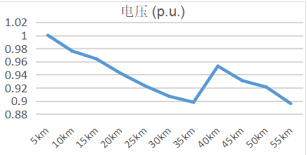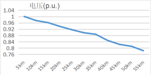 架空線路是電感性的,當電流沿線路流動時,電壓會同時下降。沿線的電壓如下所示: