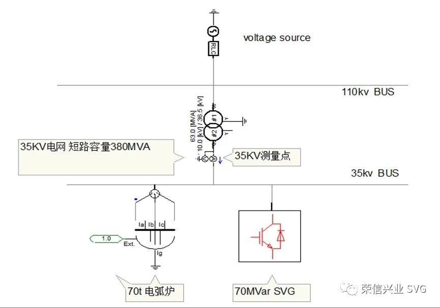 2017年8月,遼寧榮信興業電力技術有限公司簽訂滄州臨港三菱金屬電弧爐35kV動態無功發生器SVG,設備電壓等級為35kV,容量為70Mvar。現場主接線圖如下: