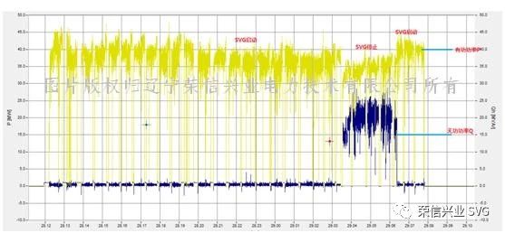 上圖為SVG啟動前后三相無功功率及有功功率曲線。