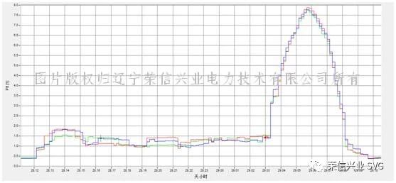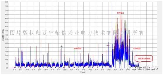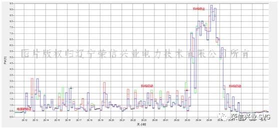 上圖為SVG啟動前后三相平均功率因數曲線。從圖中可以SVG啟動前平均功率因數低于國標下限0.9,SVG啟動后平均功率因數高于0.99。