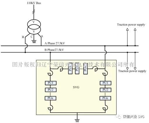 采用角型結構的鏈式SVG,基于斯坦米茲平衡化補償理論,可以對鐵路27.5kV系統的不平衡負載進行有效治理,而且基于有源濾波技術,可濾除負載產生的諧波。