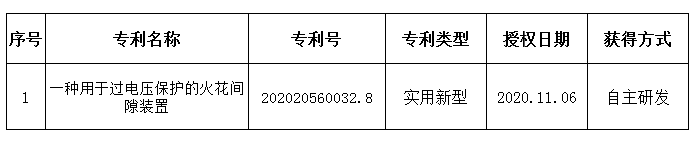 Rongxin Xingye has obtained another utility model patent, the patent name is "A spark gap device for overvoltage protection", the patent The number is ZL202020560032.8, see the table below for details