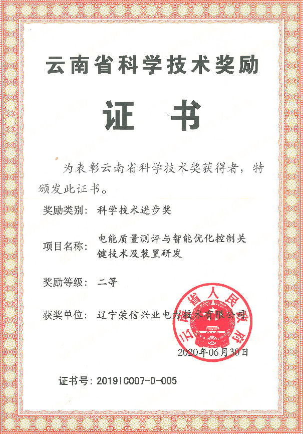 榮信興業與云南電網電科院、西南交通大學等研制的“電能質量測評與智能優化控制關鍵技術及裝置研發”項目榮獲2019年度云南省科技進步二等獎,證書見圖示。