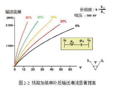 線路加裝串補后,能夠有效的提高輸送潮流,以40~50%串補度為例,線路有功潮流一般能提高30%左右。